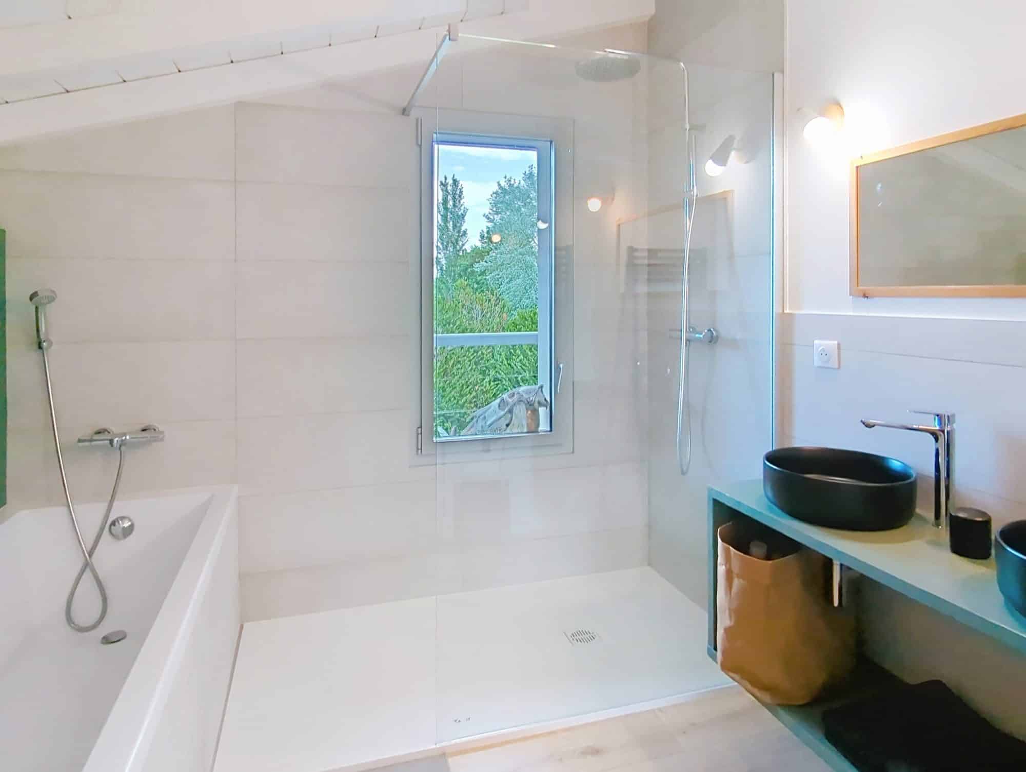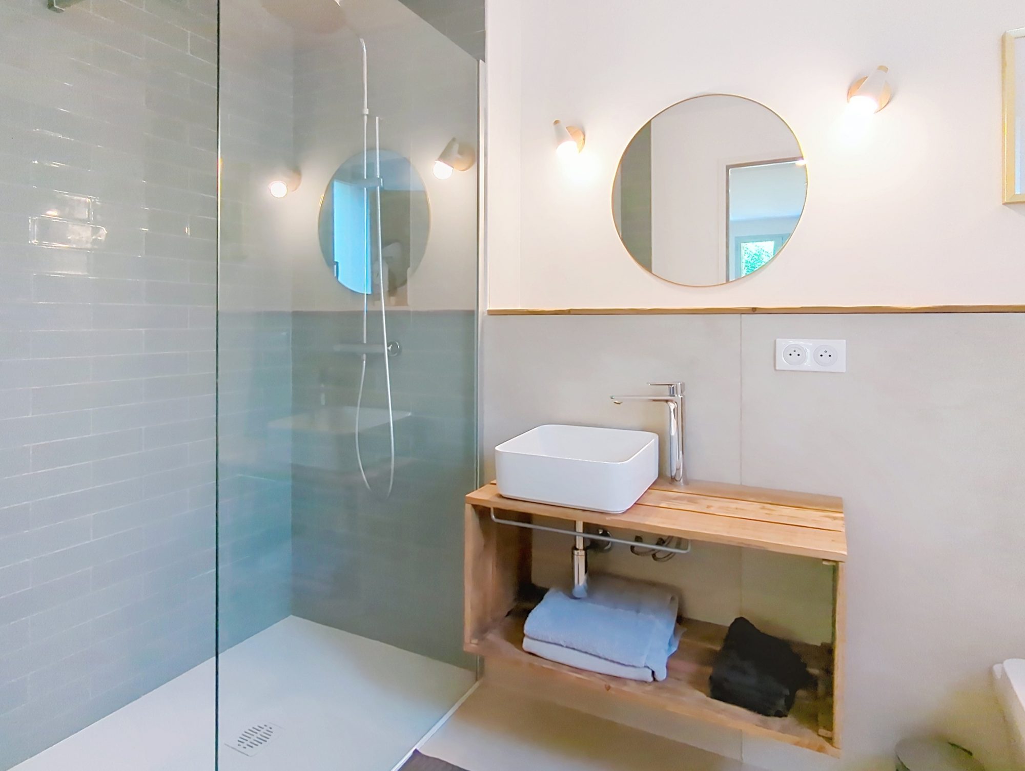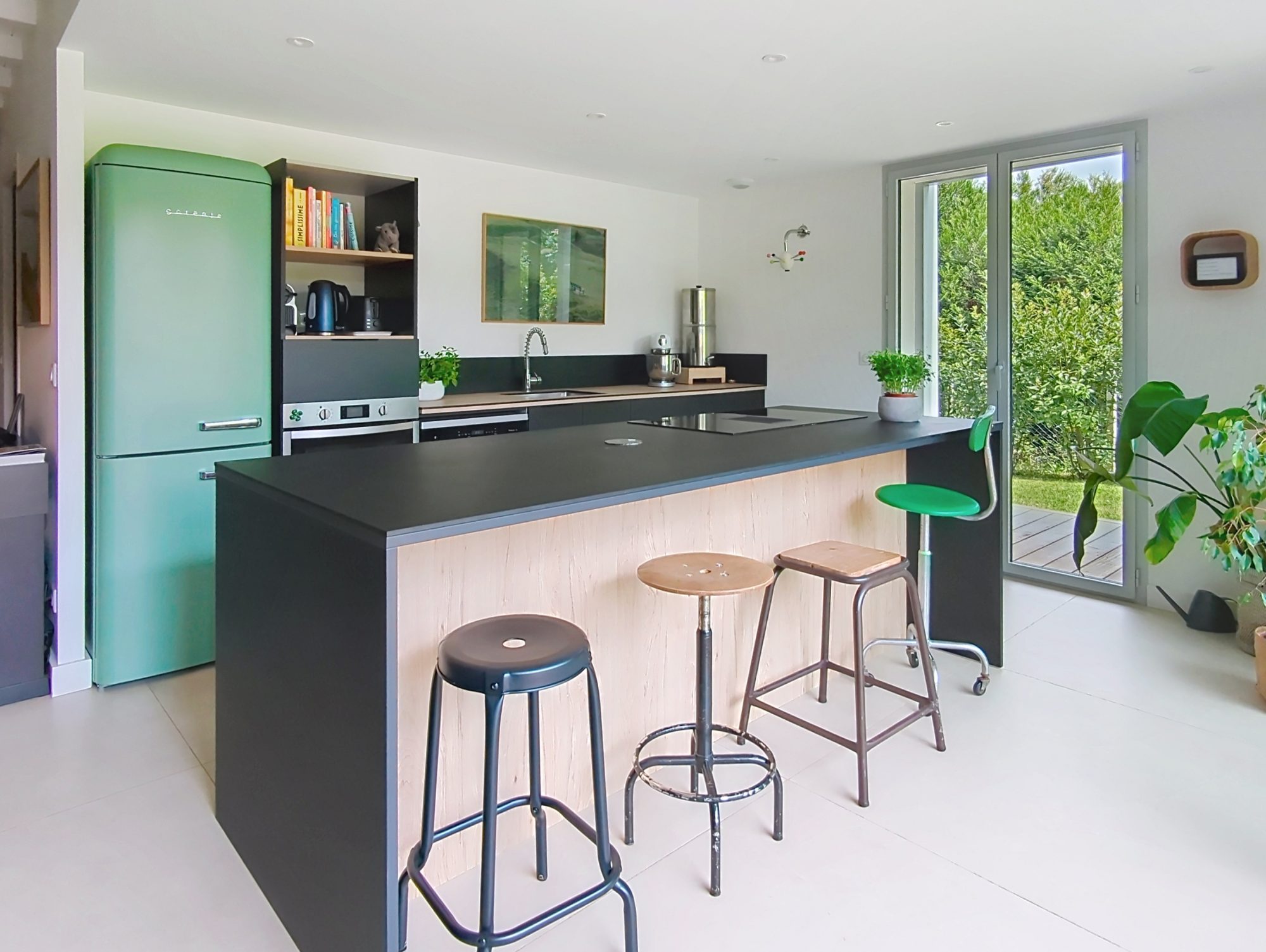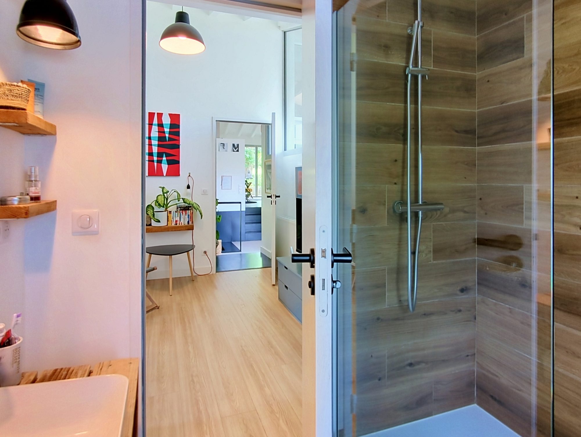 Au rez-de-jardin, un studio indépendant avec salle d’eau et kitchenette et un accès extérieur permettant une location saisonnière ou de loger un ado ou jeune adulte en toute tranquillité.
