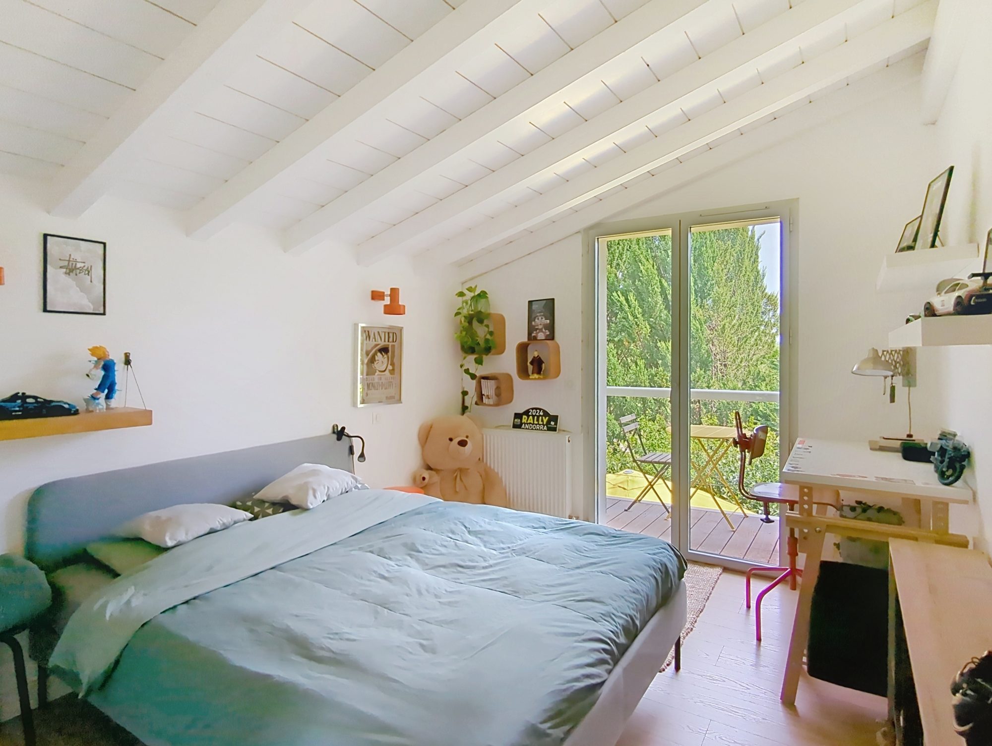 Un 2ème espace nuit séparé, en étage, dispose d’un pallier-bureau, un dressing, une salle de bains avec douche et baignoire, et une belle chambre avec un grand balcon Est.
